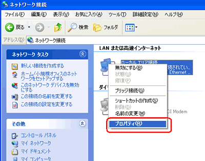 利用しているネットワークアイコン(標準はローカルエリア接続)を右クリックし、[プロパティ]をクリックします。 |