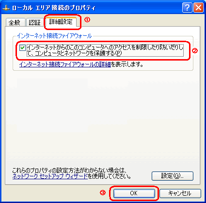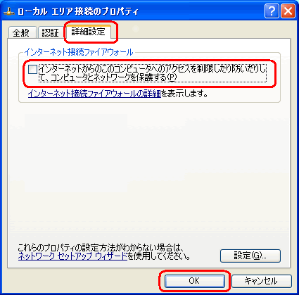 Windows XPでは、[インターネットからこのパソコンへのアクセスを制限したり防いだりして、パソコンとネットワークを保護する]チェックボックスのチェックを外して( )、[OK]ボタンをクリックします。 |