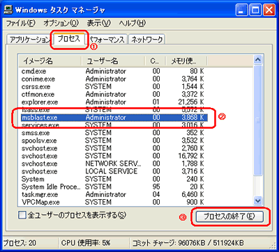 "msblast.exe"がなく、[緊急] Blasterウイルス(ワーム)の対策/予防についての[1.感染した場合の症状事例] に記載された症状が該当しない方は、 ボタンをクリックし、[タスクマネージャ]を終了して、手順7.に進んでください。 |