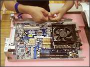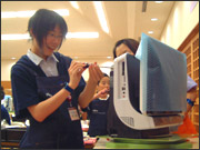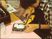 その後、参加者は工場内に移動。さっき自分たちが組み立てたパソコンが日頃はどのようなところで組み立てられているのかを見学しました。さらに、教室に戻り自分で組み立てたパソコンの電源を入れて無事起動することを確認。そのまま、パソコン使い方教室が開かれました。