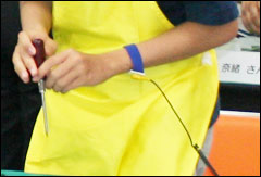 13時35分ごろ、子供たちは作業用のエプロンを、お父さんお母さんは作業着を着て、手首に静電気対策としてアースバンドを付けて準備完了。「お父さん、お母さんはなるべく手を出さないで」という説明員のお願いがあり、いよいよノートパソコンの組み立てに挑戦します!