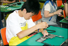 | センサーケーブル、ステータスケーブルなどを取り付けていきます。部品が細かく、金属部分がむき出しの部品も多いため、恐る恐る作業していました。また、ここで時間がかかってしまうお子さんもいました。 |