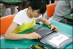 液晶ディスプレイを取り付けます。 ノートパソコンらしい部品の登場に、思わず興奮するお子さんもいました。 |