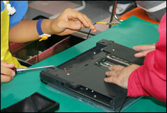 | パソコンを裏返し、ネジで裏面を固定していきます。10箇所以上をネジ締めするため、とても大変です。子供たちは懸命にドライバーを回していました。 |