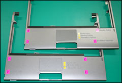 ノートパソコンの操作に使う指紋センサー、フラットポイント、クリックボタンをアッパーカバーにセットします。指紋センサーは、富士通のノートパソコンならではの部品です。
