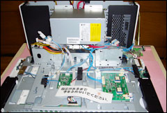 部品を取り付けたメインボードを本体に取り付けます。ちょうど、液晶ディスプレイの裏側に取り付ける形になります。 |