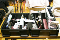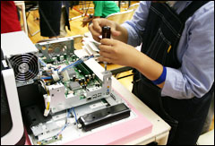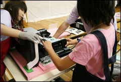 組み立ての後は、工場内にある「富士通東日本福島リサイクルセンター」に移動。使用済みとなったパソコンが分解されて、部品の種類によって分別されている様子を見学しました。