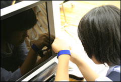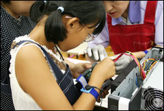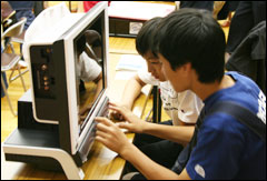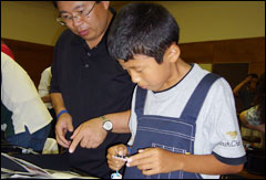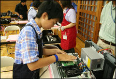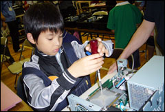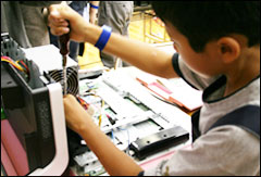 リサイクルセンターを見学した後、いよいよ自分達が組み立てたパソコンに電源を入れました。ドキドキする瞬間ですが、全員のパソコンが無事起動しました。中には我慢できずに、他の参加者が電源を入れる前に電源ボタンを押してしまったお子さんもいました。