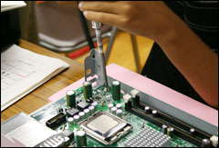 メインボードの組み立て。 ネジ締めで各種プレートを取り付けていきます。このメインボードに、メモリなどパソコンが動くために必要な機械部品を取り付けていくことになります。 |