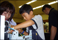 | 残りのケーブルをメインボードに取り付けます。ケーブルの向きや数の多さに戸惑うお子さんも多かったようですが、慎重に作業を進めていました。 |