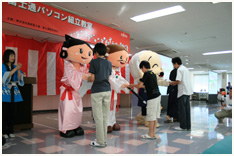 見学の途中で、「ネジ締め競争」のイベントが開催。先ほどの組み立てで鍛えた腕を活かして、参加者の皆さんでネジ締めの速さを競っていただきました。応援にかけつけた島根の地元キャラクターから、上位の参加者には、USBメモリなどの景品が贈られました。