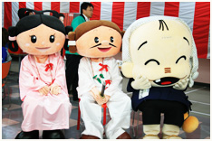 地元キャラクターが応援に駆けつけてくれました。右から「あらエッサくん」「みことくん」「まがたまちゃん」。
