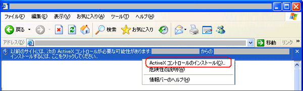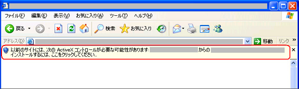 Windows(R) XP SP2のInternet Explorerはこのようなプログラムのインストールを促すダイアログを表示せずに、代わりにアドレスバーの下に新しく情報バーと呼ばれるエリアを設け、そこに下のようなメッセージを表示するようになりました。