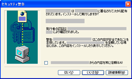 以前はWebサイトからプログラムをインストールする場合に、悪意がある、なしに関わらず、必ず下のようなダイアログが表示され、お客様の同意を求めていましたが、誤って『はい』を押してしまい悪意のあるプログラムをインストールしてしまう可能性がありました。