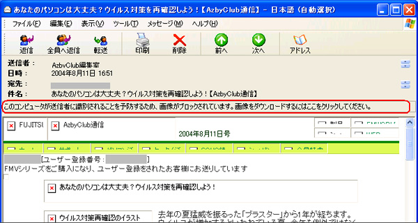 このようなスパイ活動を防ぐために、Windows(R) XP SP2のOutlook Expressは電子メールに埋め込まれた画像を自動的にダウンロードしません。