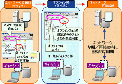 オフラインファイルにより、外出先でもキャッシュされたデータをもとに作業を継続でき、ネットワーク再接続時に自動的にデータを同期