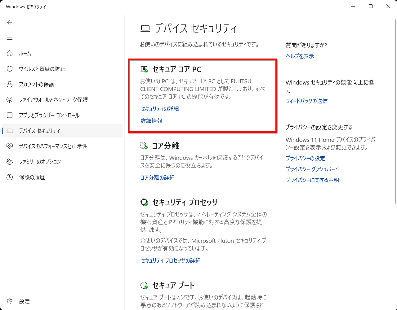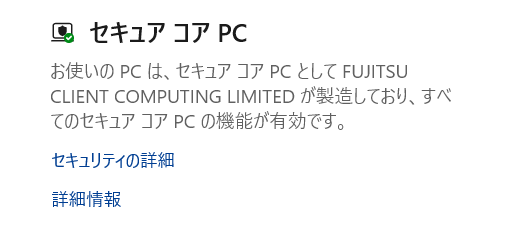 - 画面の上部にSecured-core PCの状態「セキュア コアPC」が表示されます。