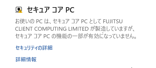 Secured-core PCになっていない場合:「機能の一部が有効になっていません」と表示されます。