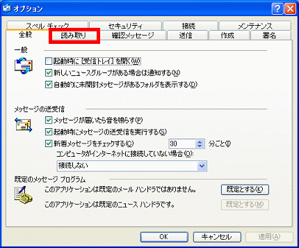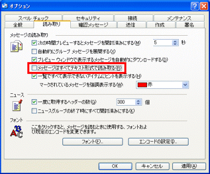 - 「メッセージの読み取り」欄の、「メッセージはすべてテキスト形式で読み取る」をクリックし、チェックを外します。