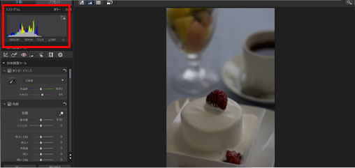 明るさを補正すると、上段のヒストグラムも右側に寄り、暗さが解消されたことが確認できます。