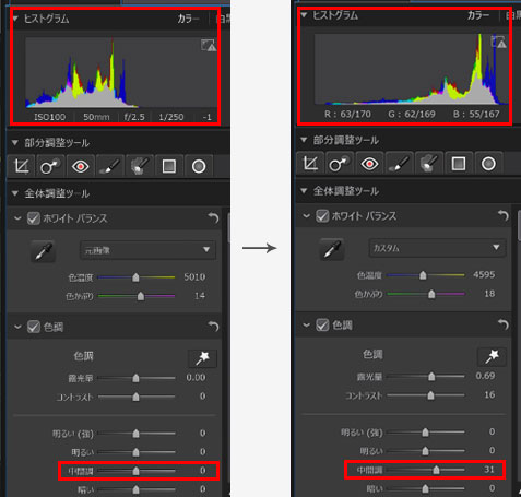 ▲「中間調」スライダーをプラス方向に動かすと、「ヒストグラム」も右側に寄る