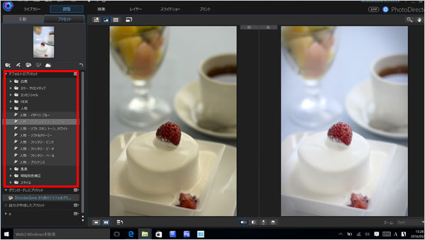 写真Bは「PhotoDirector 7 Ultra」であらかじめ設定してあるプリセットフィルターを使用した例です。使用したフィルターは、