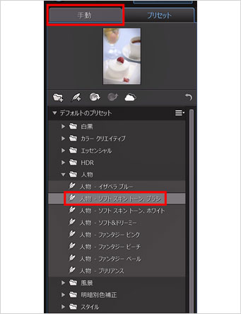 「人物 -ソフトスキントーン、ブラシ」というものです。プリセットに自分の気に入った補正結果がある場合は、