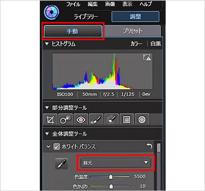 しかしRAWデータで撮った場合は、メニューにあらかじめ設けられたホワイトバランスを選択し、実行するだけで問題なく修正できます。