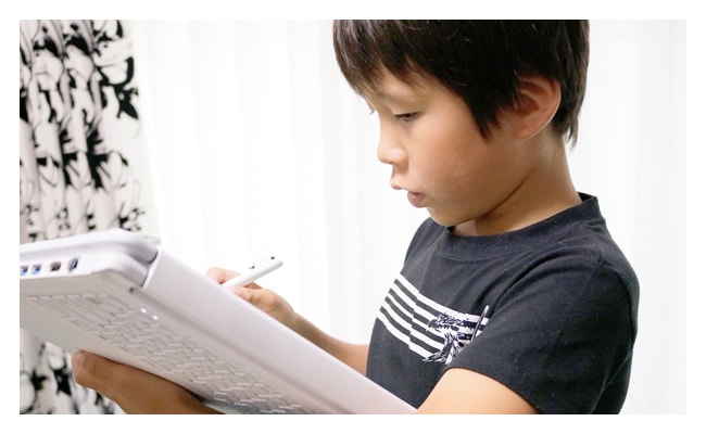 「わぁ〜!これ僕のパソコン?すごい!ここ押していい?これ触っていい?」と、クリスマスプレゼントを開けるようなリアクション。キーボードやマウス、タッチペンを触って、全てに興味深々でした。特に初めて見るマウスとタッチペンを見て「これ何?」と不思議そうにしていました。マウスの操作は最初は思い通りのところに行かず、クリックも手こずっていましたが、次の日にはコツを掴んでいました。タッチペンも翌日にはスラスラと書いていてこちらが驚いたほどです。持ち運びもしやすいので、夏休みは、祖父母の家にパソコンを持って行き使っていました。