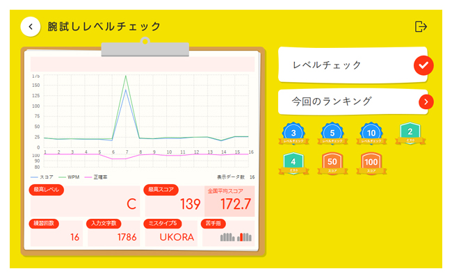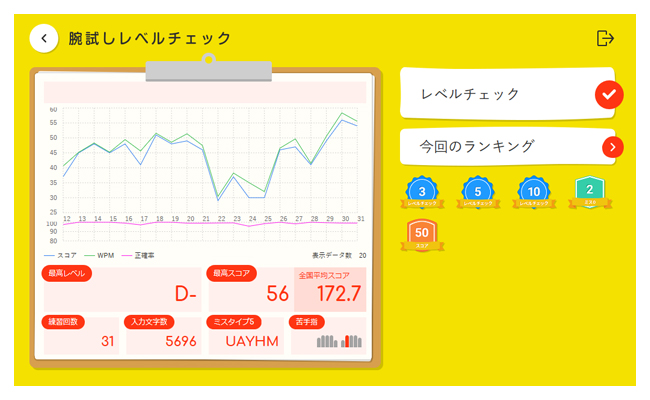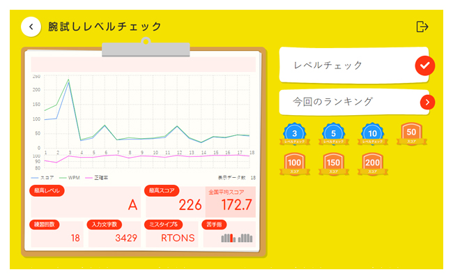 はい。ある日のランキングでは1位を取れて大喜びしていました。今はレベルBで正解率は93.2%。もっと練習して文をたくさん打てるようになって、お友達に手紙を書けるように頑張りたいそうです。