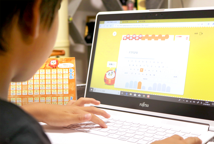 始めた頃は人差し指で文字を打っていましたが、ゆっくりですが着実にタイピングできるようになってきて、少し自信がついてきました。ふくまろが可愛いのでやる気もアップするようです。ローマ字入力表と画面をにらめっこしながら、「絶対に手元は見ない!」と意気込む姿は微笑ましく思います。