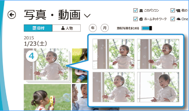 カンタンに、ちょっと先行く楽しみ方を 日付や人物ごとに自動で整理、パソコンに取り込むだけでデジタルアルバムのように。さらに楽しむ機能も。