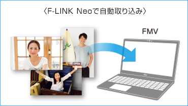 F-LINK Neoは、スマートフォンで撮影した写真や動画をワイヤレスで自動的に取り込むことができます。また、NFC搭載のパソコン(注1)なら、スマートフォンをかざすだけで写真や動画をかんたんに取り込むことができます(注2)。取り込んだ写真や動画は日付や人物ごとに自動で整理されるので、お気に入りの写真もすぐに見つけられて便利です。