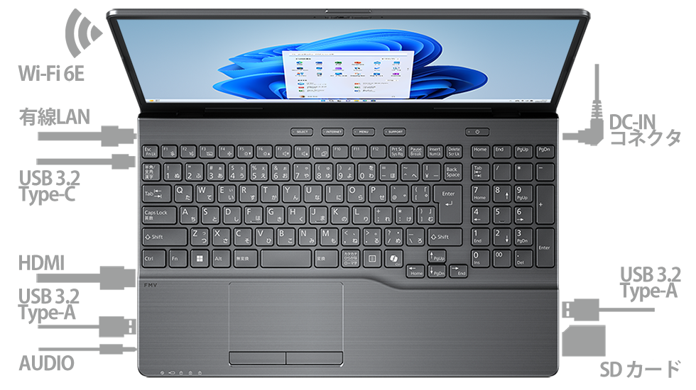 無線LANはWi-Fi 6E(11ax)に対応しており、より高速で安定した通信が可能です。