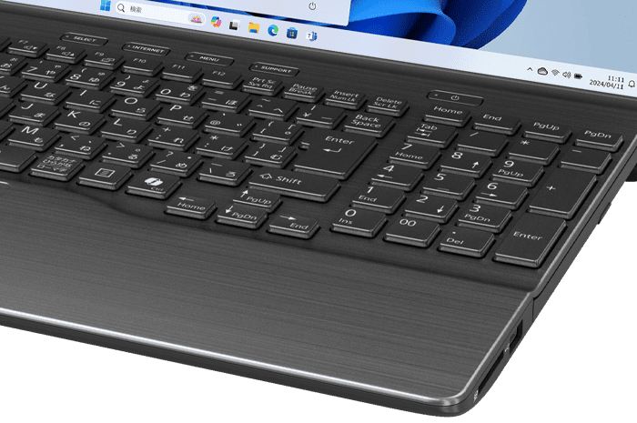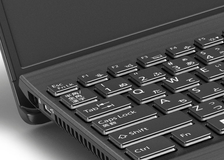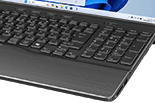 キートップをボディ同色にコーディネートし、キーの側面は透明なアクセントがキラリと輝く、美しいプリズムクリアキーを採用しています。デザインのアクセントになると同時に、一般的なノートパソコンより深いストロークのキー周りをすっきりと見せます。