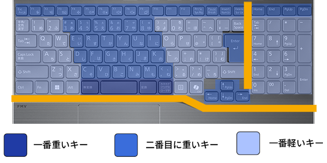キーを押す力は小指、親指それぞれ異なりますが、どの指も同じ力で押していると感じるように、キーが反応する荷重を指のポジションに合わせて3段階に調整しています。