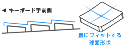 各キーを液晶側に向かって傾斜させ、階段形状の段差を持たせているので、キー列を間違えず正確なタッチタイピングができます。また、キートップをわずかに凹形状にすることにより、キーが自然に指に沿い、疲れにくいタイピングを実現します。
