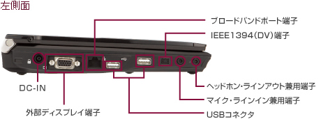 | インターフェース | ●外部ディスプレイ端子(アナログRGBミニ D-SUB 15ピン) ●マイク・ラインイン兼用端子(Ø3.5mmステレオ・ミニジャック)(注16) ●ヘッドホン・ラインアウト兼用端子(Ø3.5mmステレオ・ミニジャック)(注16) ●IEEE1394(S400 4ピン)(注17) ●USB2.0×3(注18) ●モデム(RJ-11) ●LAN(RJ-45) |
