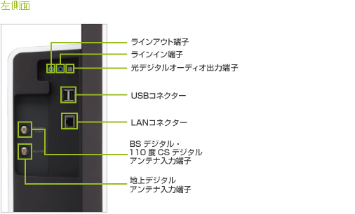 | テレビアンテナ入力/B-CASカードスロット | 地上デジタルアンテナ入力端子、 B-CASカードスロット、 地上デジタルアンテナ入力端子、 BSデジタル・110度CSデジタルアンテナ入力端子、 B-CASカードスロット |