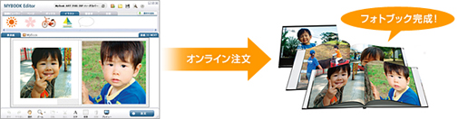 「MyBookEditor」なら、撮りためた写真を使って、レイアウトや背景を決めるだけの簡単操作で本格的なフォトブックができます。そのままインターネットから申し込めば、素敵に製本されたフォトブックが届きます。(注6)