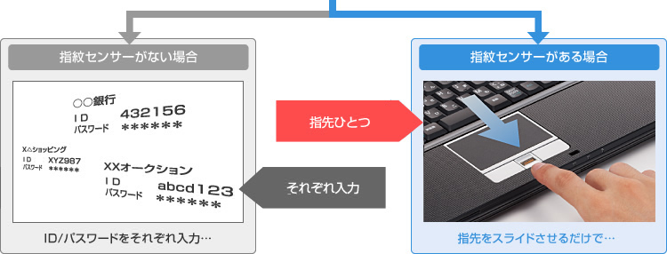 キーボードによる文字入力の手間が省けます。また、WebサイトごとにIDとパスワードを管理できるため、指一本で各種Webサイトにログオンできます。