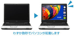 現在の稼働状態をメモリに保存して電源をOFFにできる「スリープモード」を導入。スリープモードにしておけば、わずか数秒でパソコン使用を再開できるので、これまでのように起動時間でイライラすることがありません。(注6) 注6 シャットダウンをした場合や休止状態の場合、起動に時間がかかります。 |