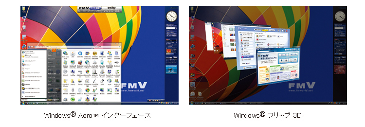 透明感あふれるガラス風の透過ウィンドウにより、デスクトップアイコンや作業中のフォルダなどを閉じることなく確認できます。また、「Windows®フリップ 3D」を使えば、作業中のウィンドウを3Dで確認できるので、わずらわしいウィンドウ操作を解消します。