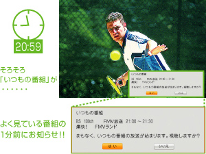 視聴履歴(曜日/時間帯/チャンネル)を蓄積して、傾向を分析。いつもみている番組を見逃さないようにお手伝いします。(注3) 注3 「DigitalTVbox」がタスクトレイに常駐している必要があります。 |