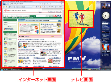 「ウィンドウ表示」に対応し、マウス操作でウィンドウの大きさや配置を自由に変更可能。また、マウス操作でコントロールパネルの操作ができます。インターネットやメールをしながら、テレビを楽しむことができます。(注4) 注4 インターネット画面に表示される内容によっては、テレビの映像がスムーズに表示されない場合があります。また、動画を再生・編集するソフトウェアとの併用はできません。 |