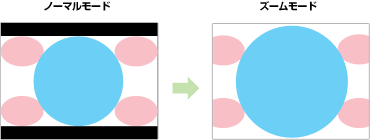 「DigitalTVbox」でリモコンの「画面サイズ」ボタンを押すと、お好みのサイズに合わせて、画面が切り替えられます。16:9のデジタル放送のワイドな映像も、リモコンの「画面サイズ」ボタンで「ノーマル」「ワイド」「ズーム」の3つの表示パターンからお好きな表示で楽しむことができます。 |