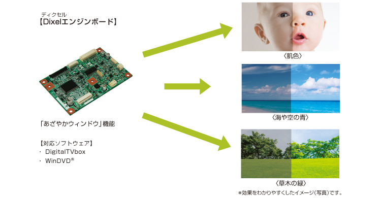 「Dixelエンジンボード」の「あざやかウィンドウ」機能により、海や空の青、草木の緑や肌色を色鮮やかに、また、コントラストのきいたメリハリのある映像で表示し、デジタル放送を色鮮やかでエッジの効いた美しい映像で楽しむことができます。さらに、「ガンマ補正」で自然に近い色の表示を実現しています。