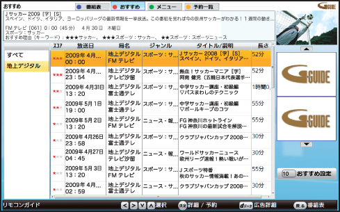 リモコンの番組表ボタンを押すだけで、新聞のテレビ欄のように見やすい電子番組表を表示。番組を選ぶと詳細情報が表示され、視聴も録画予約も簡単にできます。 ●番組はジャンルごとに色分けして表示。また、指定したジャンルの番組だけを際立たせて表示させることもでき、お目当ての番組を探しやすく便利です。 ●「毎週予約」機能で毎週同じチャンネル、同じ時刻の番組を自動録画することも可能です。 |