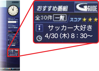 デスクトップ上のサイドバー内のガジェットでも情報を表示。番組表を表示しなくても、好みに合った番組をおすすめしてくれます。 ![]() |