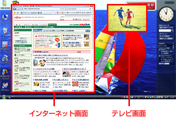 「ウィンドウ表示」に対応し、マウス操作でウィンドウの大きさや配置を自由に変更可能。また、マウス操作でコントロールパネルの操作ができます。インターネットやメールをしながら、テレビを楽しむことができます。(注4) 注4 インターネット画面に表示される内容によっては、テレビの映像がスムーズに表示されない場合があります。また、動画を再生・編集するソフトウェアとの併用はできません。 |